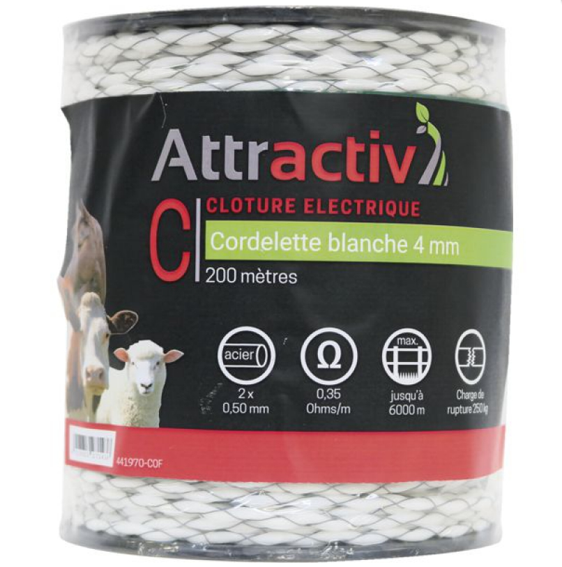 Cordelette blanche 4mm bobine 200m, 2 conducteurs 0,50 acier