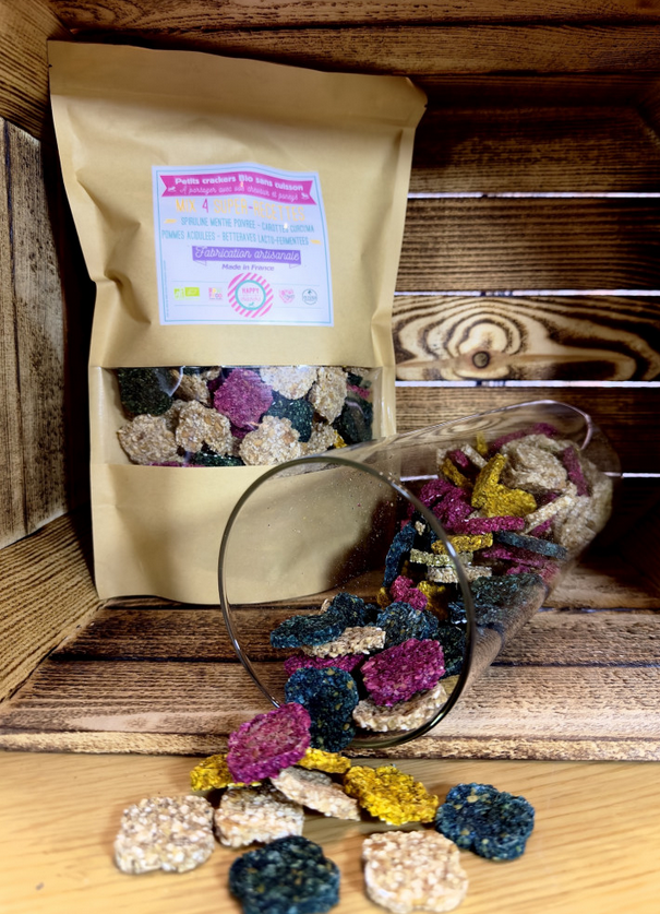 Crackers MIX de 4 SUPER-RECETTES : Carottes Curcuma / Pommes acidulées / Spiruline Menthe poivrée / Betteraves Lacto-Fermentées. Notre best-seller pour un mélange healthy et Bio de 4 super recettes.