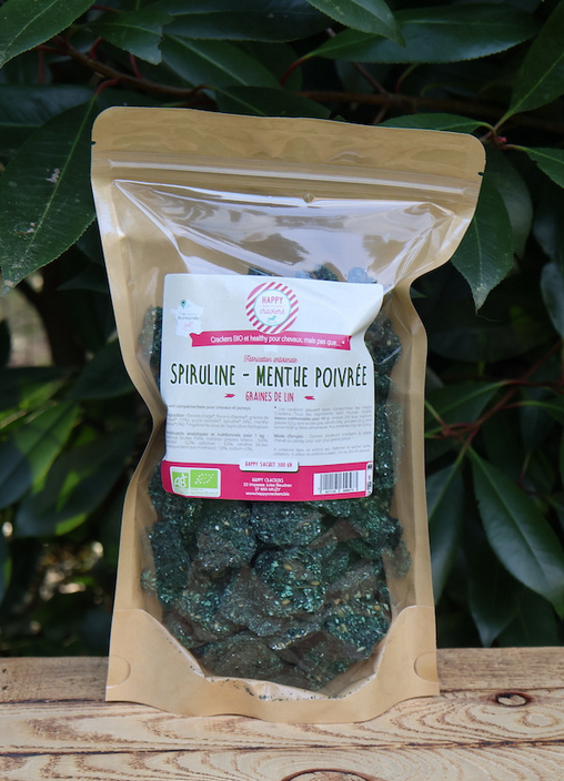 Crackers healthy à la spiruline Bio et à la menthe poivrée. Une association fraiche et healthy, pour une friandise saine et gourmande pour votre cheval.