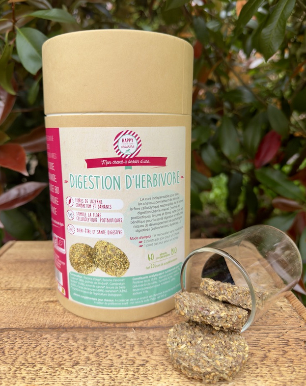 La cure de première intention lors de troubles digestifs, problèmes gastriques et sensibilité digestive. Digestion d’herbivore est une source naturelle de pré et post biotiques, riche en béta-glucanes et aussi en fibres, indispensables pour prendre soins de la flore cellulolytiques du cheval herbivore !