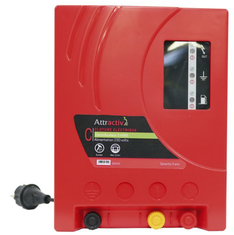Electrificateur S 6000 très puissant avec deux sorties d’enclos (forte / faible) , contrôle visuel de la tension de la clôture et contrôle visuel séparé de la mise à la terre 3,6 Joules délivré : garantie 3 ans