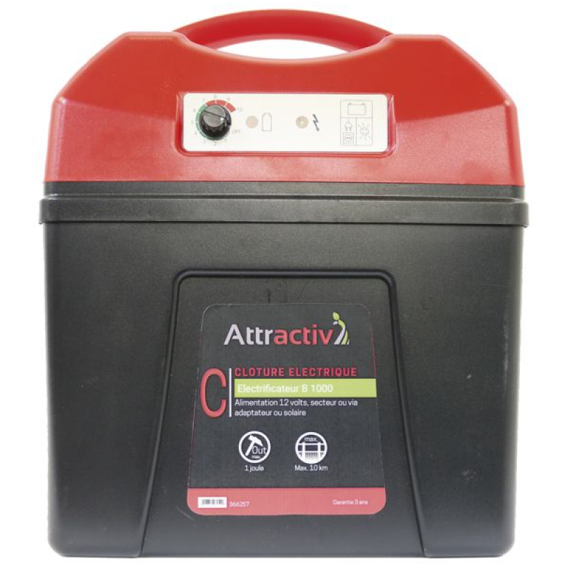 Electrificateur B 1000 puissant pour utilisation mobile , réglage de puissance , 1 Joule délivré (fonctionnement possible avec panneaux solaire ou en 230 V via un adaptateur non inclus)