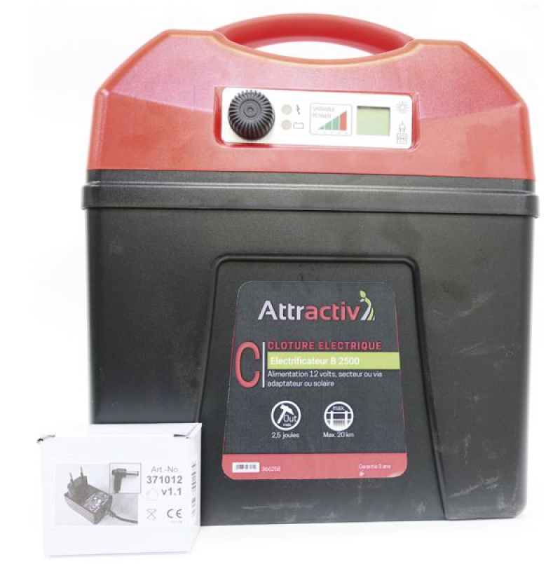 Electrificateur B 2500 très puissant pour utilisation mobile , réglage de puissance , 2,5 Joules délivrés (fonctionnement possible avec panneaux solaire ou en 230 V via un adaptateur non inclus)