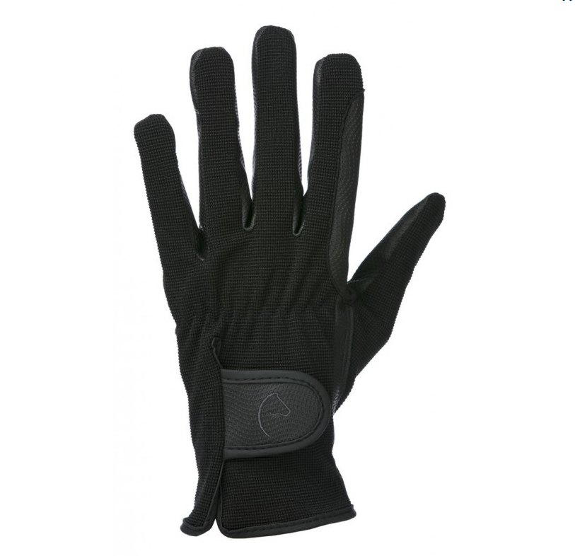 Robustes gants antidérapants avec le dessus de la main élastique. Passages de rênes renforcés. Poignet élastiqué et fermeture par rabat auto-agrippant. Composition : 50 % polyester, 50 % polyuréthane.